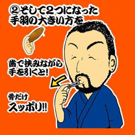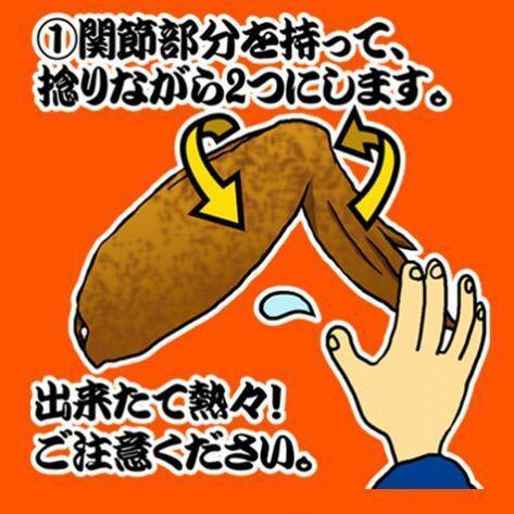 必読★酔っ手羽名物★伝説の手羽先の愉しみ方【その1】関節部分をもって、ひねりながら2つにします。出来立て熱々!ご注意下さい。